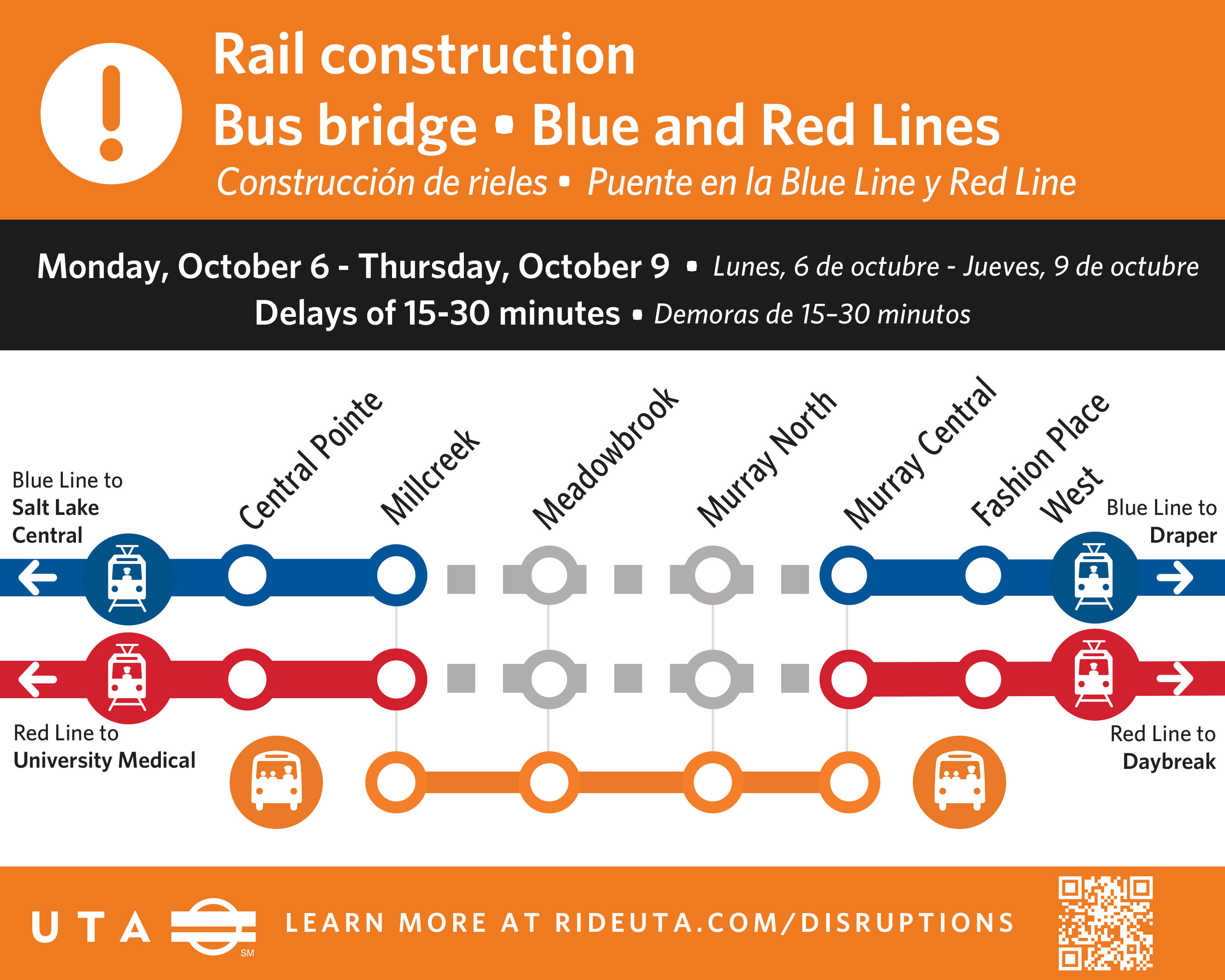 • A bus bridge will be in place between Midvale Center and Sandy Civic Center stations.